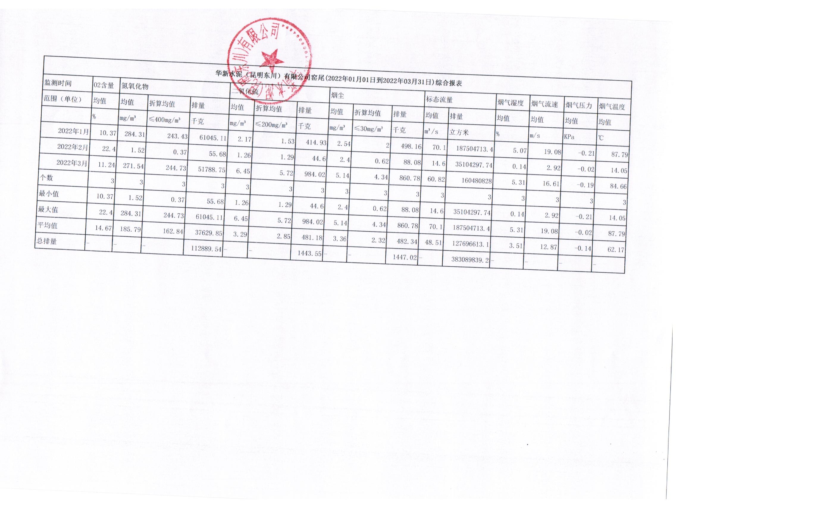 4、華新水泥(昆明東川)有限公司2022年第一季度窯尾煙氣在線(xiàn)監測月平均值季報表